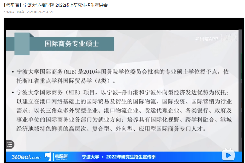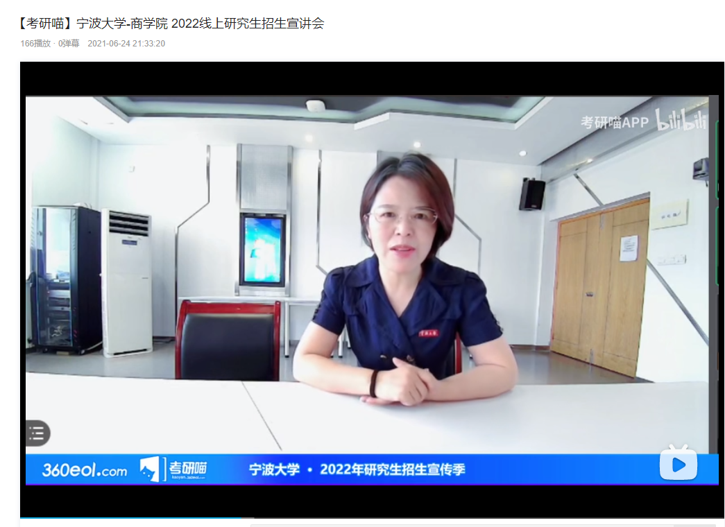 2021年6月23日,黄色小说 2022线上研究生招生宣讲会在bilibili线上平台举行。国际商务专业硕士学位点负责人杨丽华讲授参加了线上宣讲会,介绍了我校MIB项目的培养目标、特色及专业建设情况。