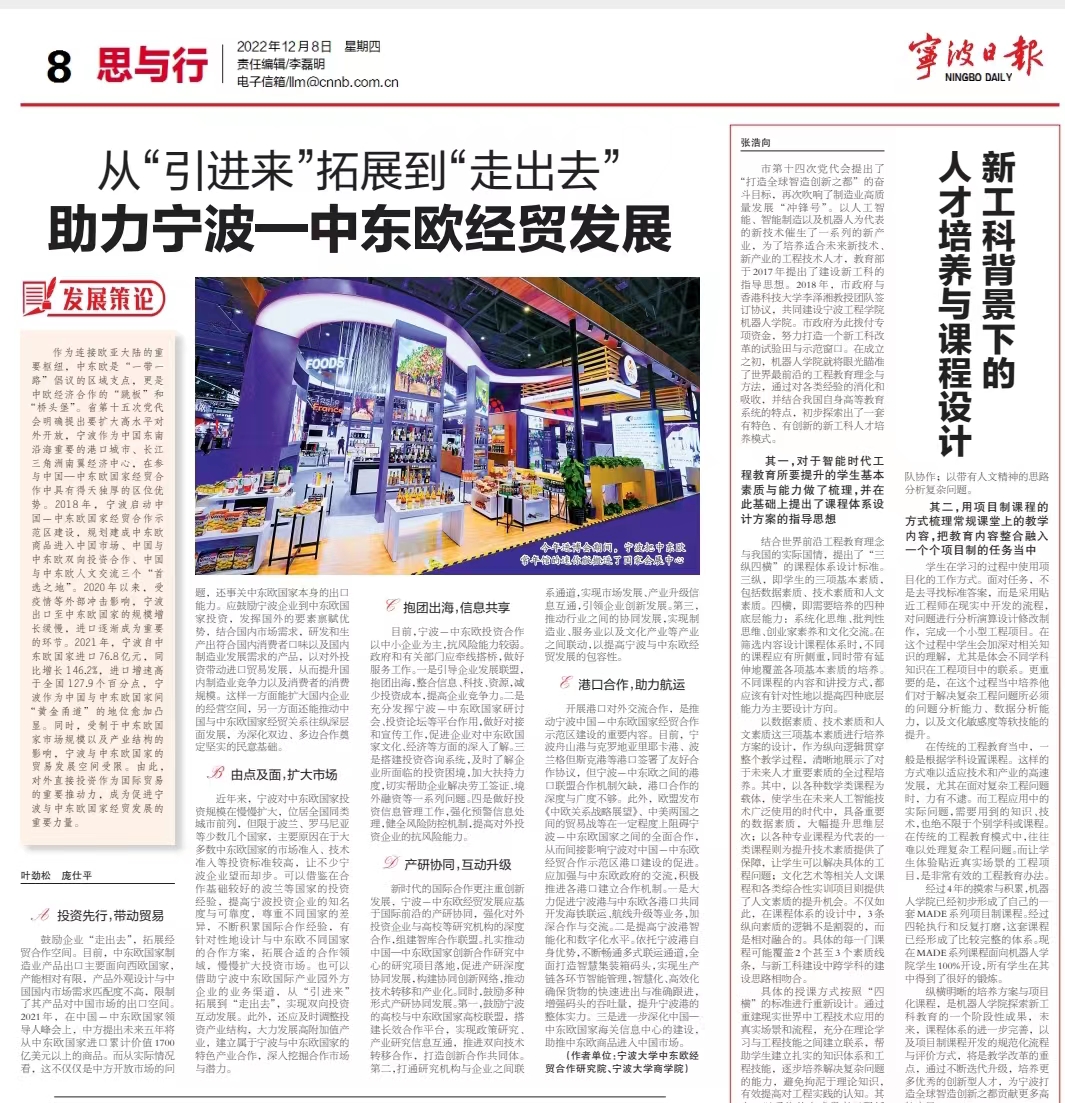 2022年,我校国际商务专硕导师在《宁波日报》理论版发表系列文章,探索推动宁波市高水平对外开放建设的发展路径。
