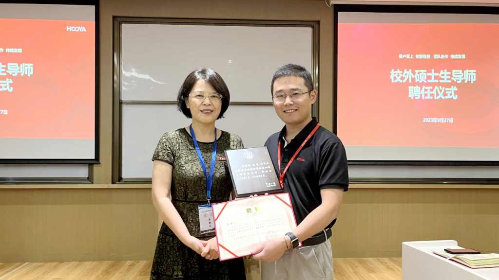 50余名师生一同见证仪式举行,人力资源管理中心刘总代吴总领授硕士生导师聘书。