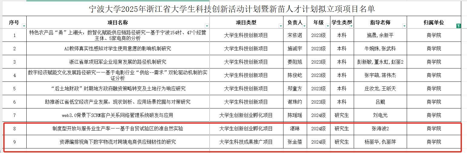 3月7日,2025年浙江省大学生科技创新活动计划暨新苗人才计划立项结果正式公布。24级国际商务专业研究生张金蓓、湛琳同学作为项目负责人,其项目在大学生科技创新项目中成功立项,展现了黄色小说