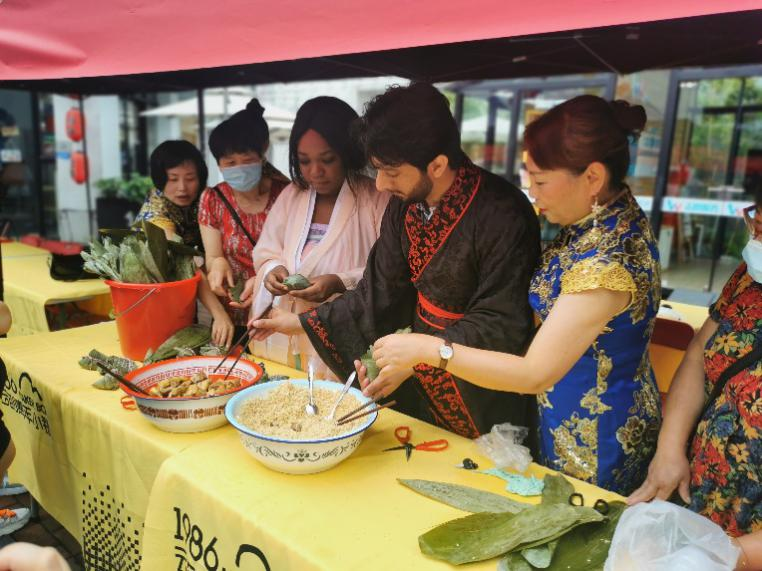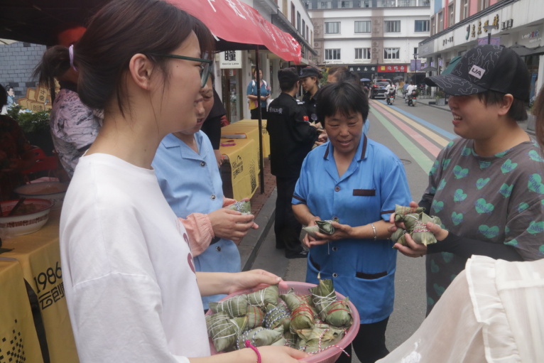 包粽子体验区的中外大学生身穿汉服,在社区阿姨们的手把手指导下,认真地学习包粽子。包好的粽子将送给在小镇辛苦工作的环卫工人和保安,让他们提前感受端午佳节的浓浓氛围。