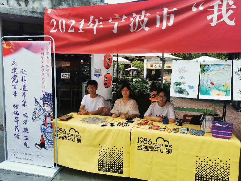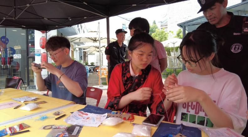 在云创小镇志愿服务we站前的非遗市集上,支部成员带来了香囊、结绳、手袋等各式手工编织工艺品,一旁的手工香囊制作区,几位学生正在穿针引线,学习制作端午香囊。