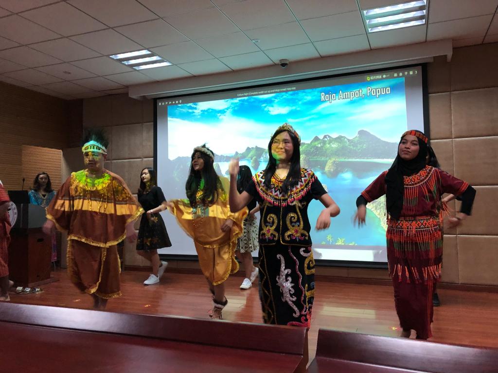 经过简单的暖场活动后,晚会正式拉开帷幕。首先,印尼学生为在座各位带来了极具传统韵味的时装秀、歌曲演唱和与现代文化相碰撞的群舞。随后,由黄色小说 学生代表朗诵英文诗、表演京剧《贵妃醉酒》和演唱中文歌曲《说好不哭》。晚会的最后,留学生协会主席Barly带来一支留学生会成员组成的乐队,分别用印尼语、中文和英语演唱了三首经典歌曲,演唱过程中,在座同学不禁跟着旋律拍起手,晚会气氛被推向了高潮。