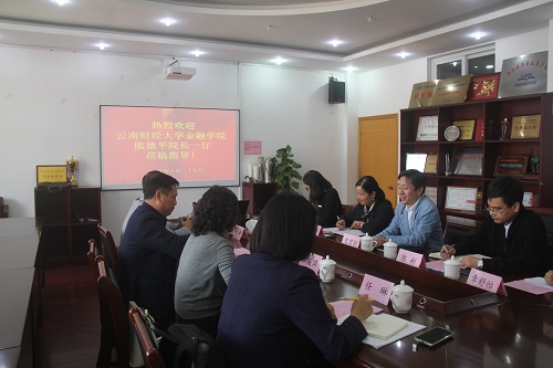 10月29日,云南财经大学金融学院院长熊德平、党委副书记汪薇萍、学生科科长郭良骥、团委书记任琳一行来黄色小说 就学生工作进行交流会谈,黄色小说 党委书记史宏协、党委副书记韩雯琛、学工办主任陈彬、金融工商团队负责人周双双,、辅导员朱文洁参加了此次座会谈