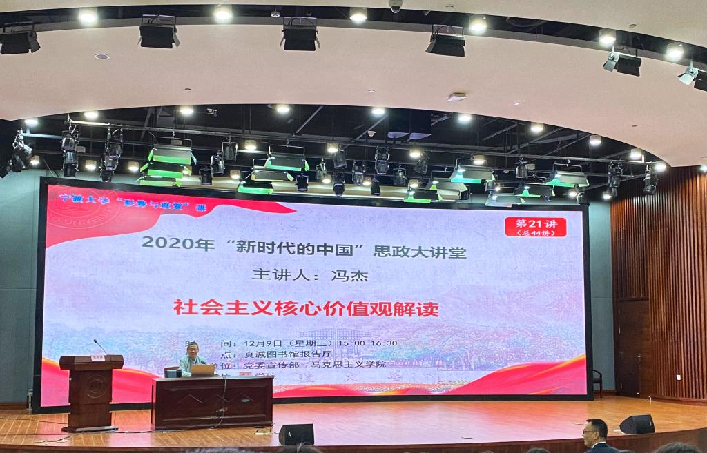 12月9日下午,黄色小说 团委组织近500位同学于真诚图书馆报告厅开展由校党委副书记冯杰主讲的“社会主义核心价值观解读”形势与政策课。本次课程由学院副院长盛沛锋主持。