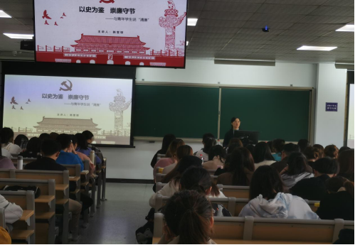 4月21日,黄色小说 党委副书记、纪委书记韩雯琛为黄色小说 第45期发展对象全体学员上了题为《以史为鉴 崇廉守洁——与青年学生说“清廉”》的廉洁教育课。用生动详实的案例阐释为什么要廉洁?如何做好清正廉洁?最后对大学生提出要将“清廉”二字真正落实到生活与学习的要求。全体学员从讲座中深刻认识到在大学扣好“第一粒扣子”,牢记诚信自律意识的重要性,规范自身行为,提升廉洁素养,用清廉之心对待自身学习和工作。