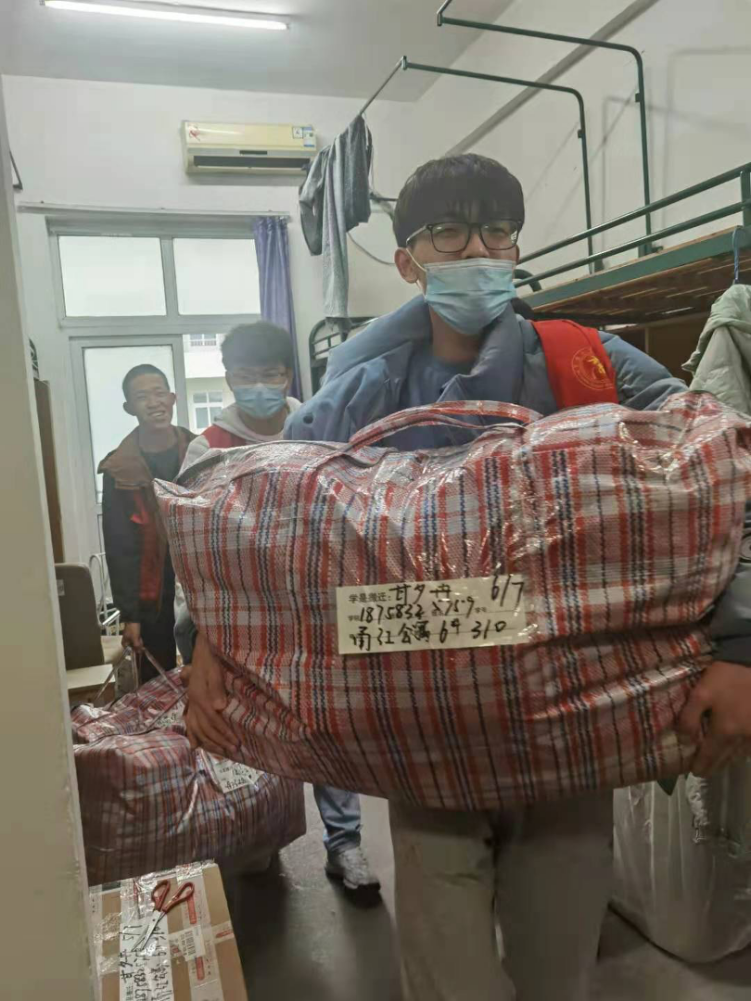 搬迁寝室当天,学院辅导员老师走访寝室,提醒同学们做好个人物品的整理,每个物件都必须贴好标签以防丢失,还提醒志愿者们务必注意安全。