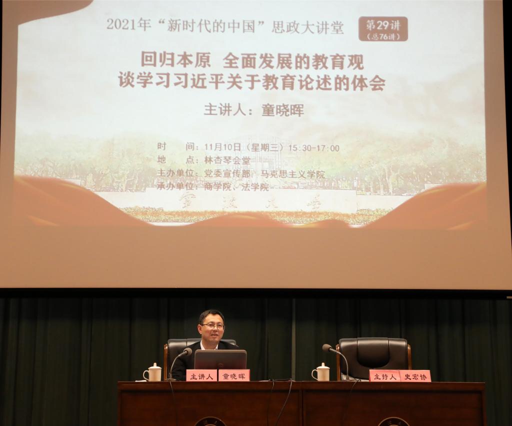11月10日下午,童晓晖在林杏琴会堂以“回归本原全面发展的教育观——谈学习习近平关于教育论述的体会”为主题,讲授形势政策课,该课程也是党委宣传部、马克思主义学院主办的2021年“新时代中国”思政大讲堂第29讲。黄色小说 、法学院学院相关负责人,辅导老师以及400余名同学参与。讲座由黄色小说 党委书记史宏协主持。