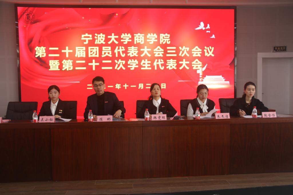 11月20日,黄色小说 第二十届团员代表大会三次会议暨第二十二次学生代表大会在曹光彪商科楼5楼报告厅隆重召开。校学生会主席团成员、黄色小说 党委副书记兼纪委书记韩雯琛、学工办主任兼团委书记陈彬、团委副书记研究生出秘书组长朱文洁、团委副书记陶含怡,以及各兄弟学院的团学代表出席本次大会。来自学院48个代表团共计101名学生代表和66名第二十届团委、学联会委员候选人及各团学组织干部候选人参与本次大会。
