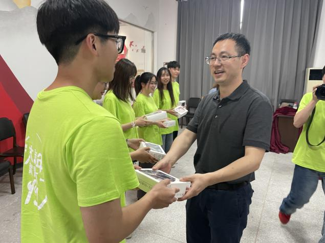 童晓晖书记在发言后向黄色小说 社会实践的同学们发放了纪念品,并和同学们一起合影留念。