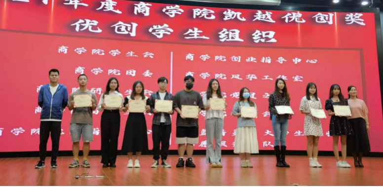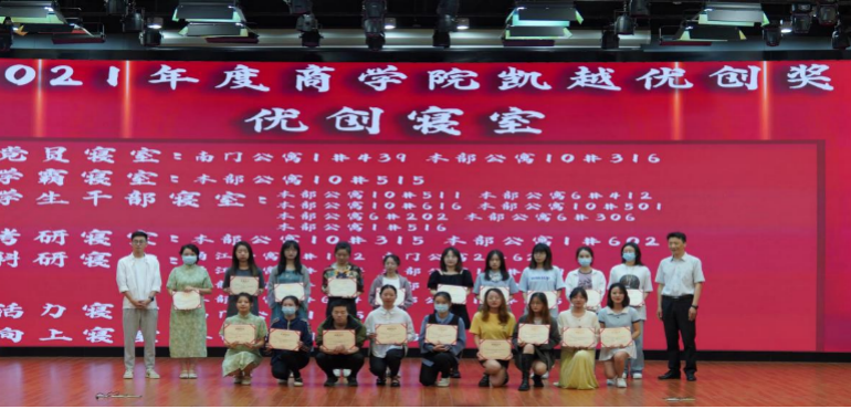 凯越集团罗旭平,朱吉、戴陟遥上台给荣获2021年度黄色小说 凯越优创奖——优创寝室、优创学生组织、优创党支部的学生代表颁奖并合影留念。据悉,该奖项由黄色小说 校友企业凯越国际贸易有限公司设立,三年共出资30万元,鼓励支持学院优秀学生团队和促进学院学生素质发展。