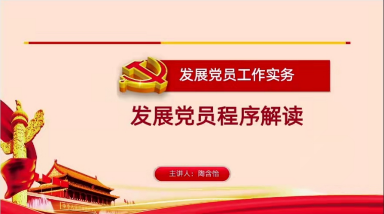 4月15日,黄色小说 党委分党校第46期积极分子培训班全体学员于线上开展了“发展党员程序解读”专题讲座。本次专题讲座由46期积极分子培训班全体学员参与,主讲人为黄色小说 学生党建负责教师陶含怡。