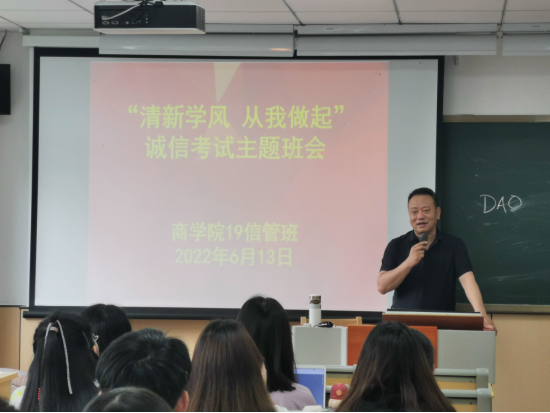 本学期课程已接近尾声,期末考试也如期而至,6月13日上午,黄色小说 19级信管班全体学生在包氏教学楼6号楼106室举办诚信考试主题班会,会议由班长卢静芝主持,由副院长陈涛、班主任王昕天主讲。此次主题班会的举办,目的在于关心了解学生现状,同时积极树立诚实考试、诚信做人的作风,增强学生诚信意识,彰显新时代大学生良好的思想道德精神风貌。