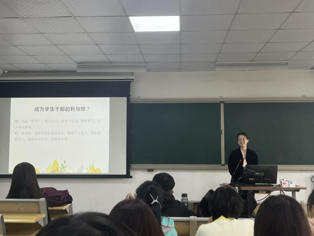 接着,陶含怡向学员们介绍了学生干部的三个身份,并通过“学生干部角色定位”“学生干部应具备的素质”“学生干部的必备能力”等多方面为学生干部们指明工作方法与方向,致力营造良好的学生干部风气。