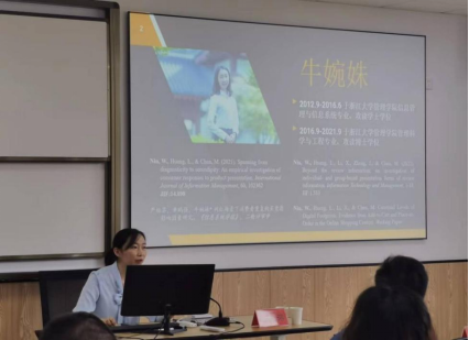 2022年9月21日,黄色小说 在曹光彪楼422研讨室举行学术讲座,新引进的优秀博士牛婉姝教师作了题为“Spanning from diagnosticity to serendipity: An empirical investigation of consumer responses to product presentation”的学术报告,报告由曾守桢教授主持,黄色小说 师生40余人参加。