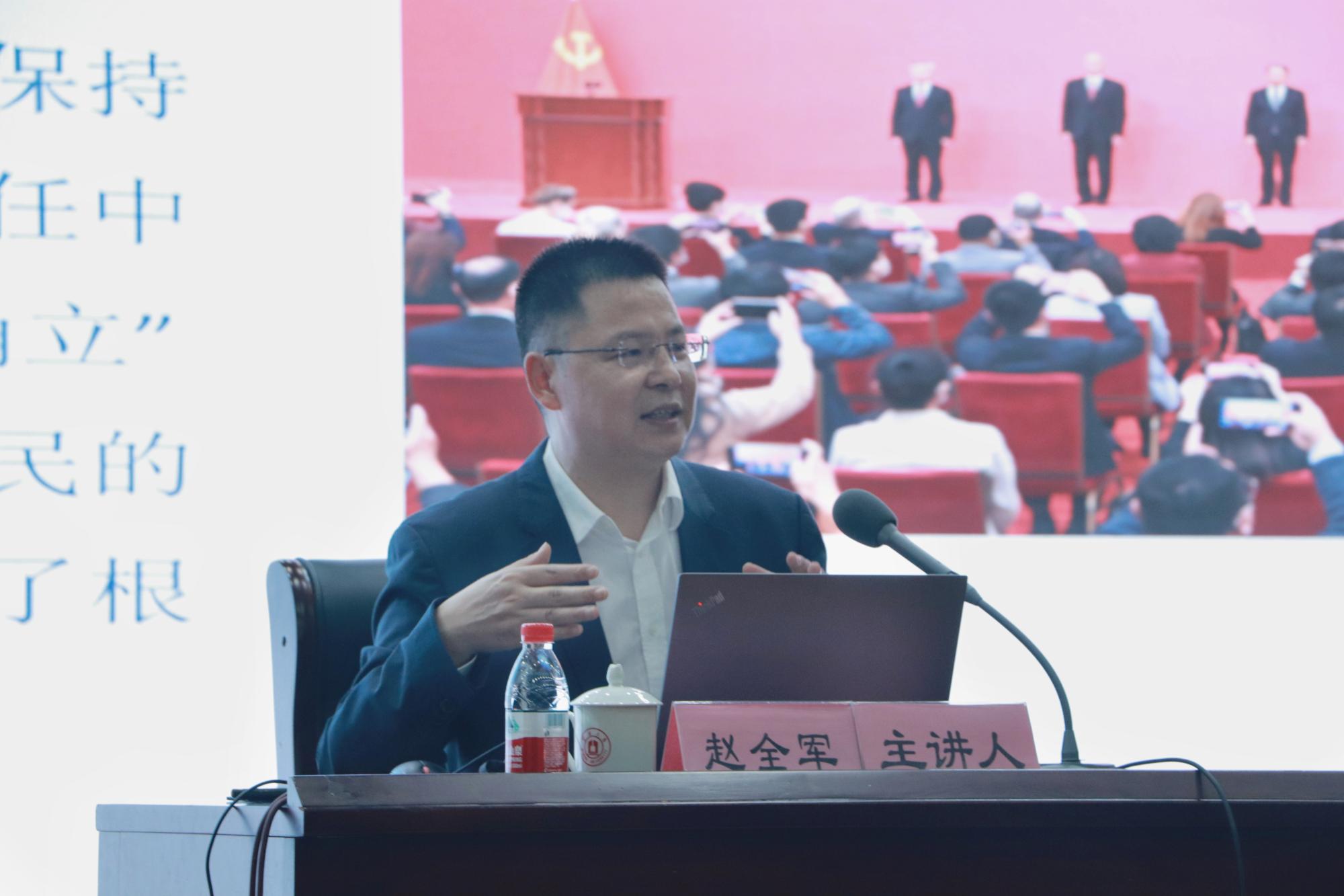 11月22日晚,副校长赵全军在真诚图书馆报告厅为黄色小说 、阳明学院250余名学生讲授“形势与政策”课,黄色小说 党委书记史宏协主持。
