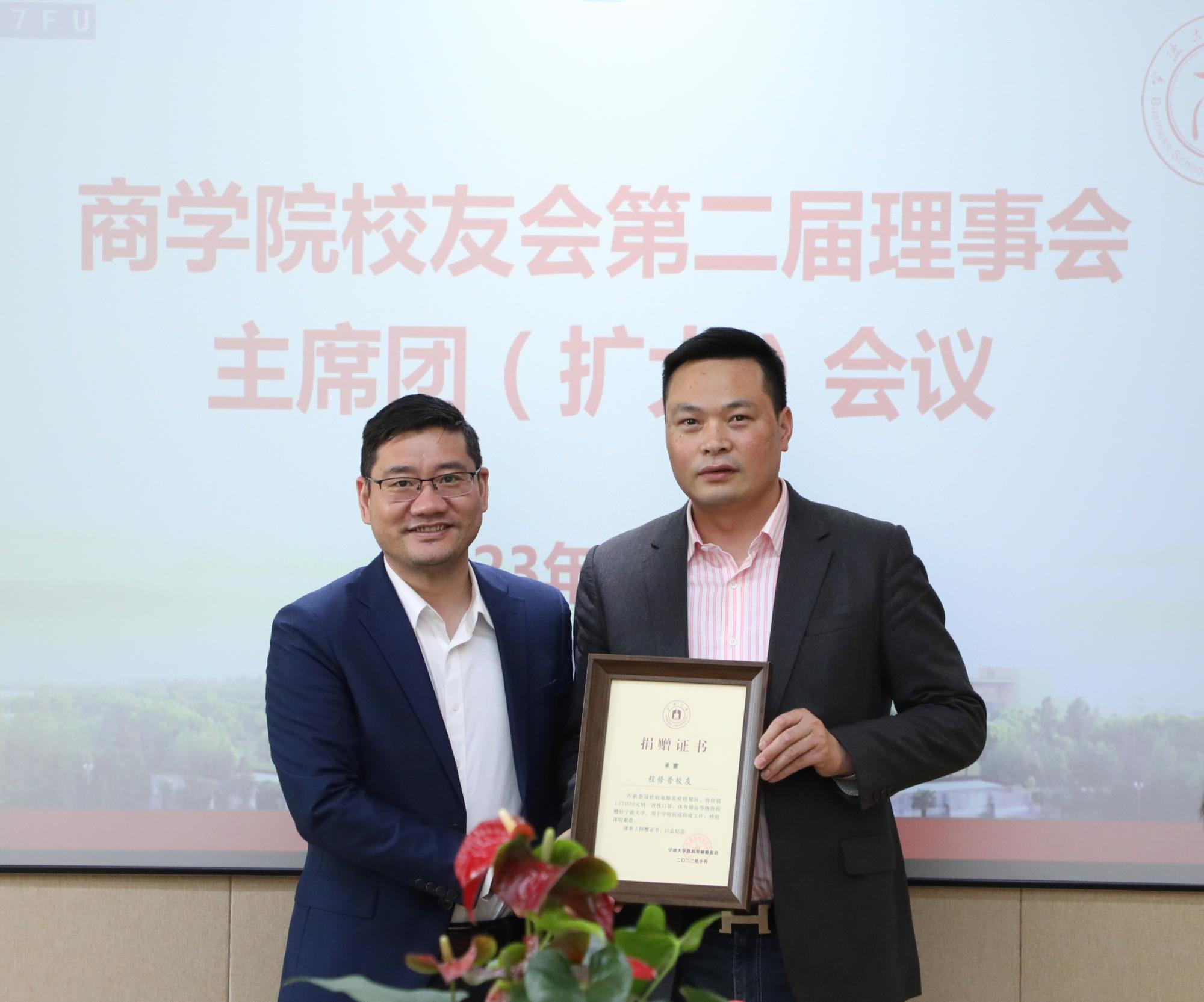 会议伊始,韩雯琛介绍了黄色小说 校友会的总体情况,并介绍了本次会议的与会人员。随后,院长金祥荣介绍了学院党政班子的调整情况。会议审议通过了学院校友会第二届理事会主席团成员调整与增补名单,以及理事增补名单:秘书长由盛沛锋、陈涛调整为彭新敏、谢慧明;增补黄文杰、厉立群、潘立平、程修普、张国君为副会长,增补应筱燕为理事。院长金祥荣为新任副会长及理事颁发了聘书。谢慧明、彭新敏分别为潘立平和程修普校友颁发了捐赠证书,以答谢他们在2022年疫情期间对学院的慷慨捐赠抗疫物资。