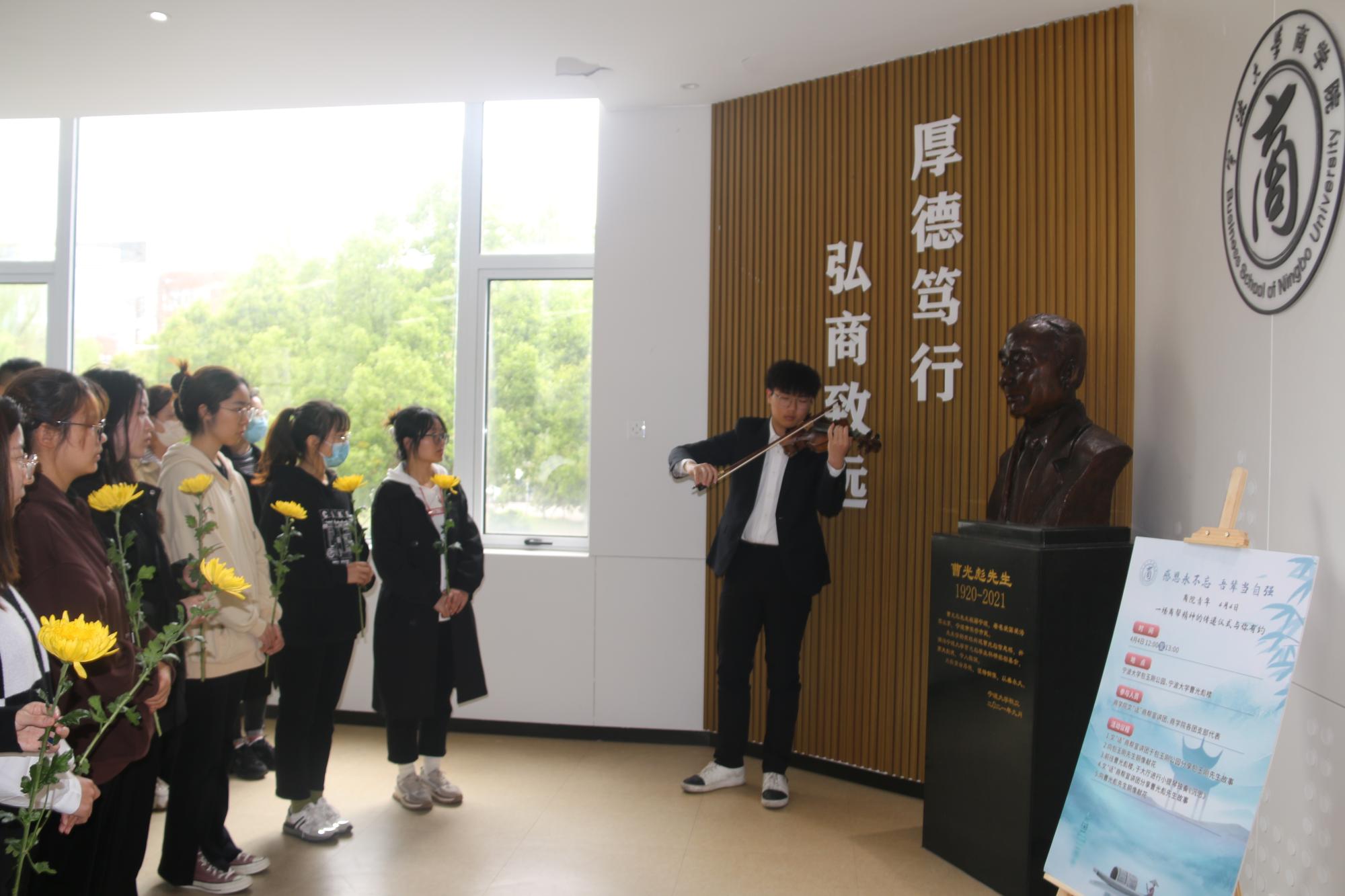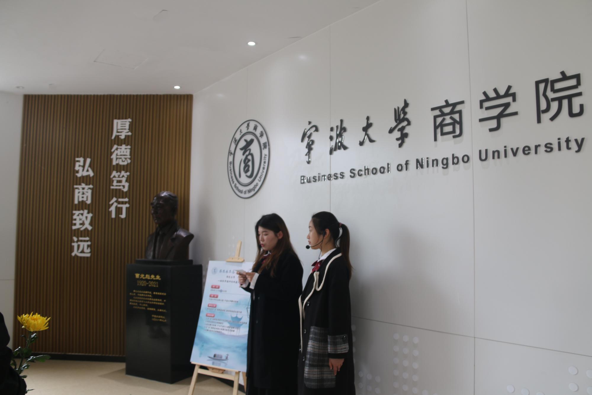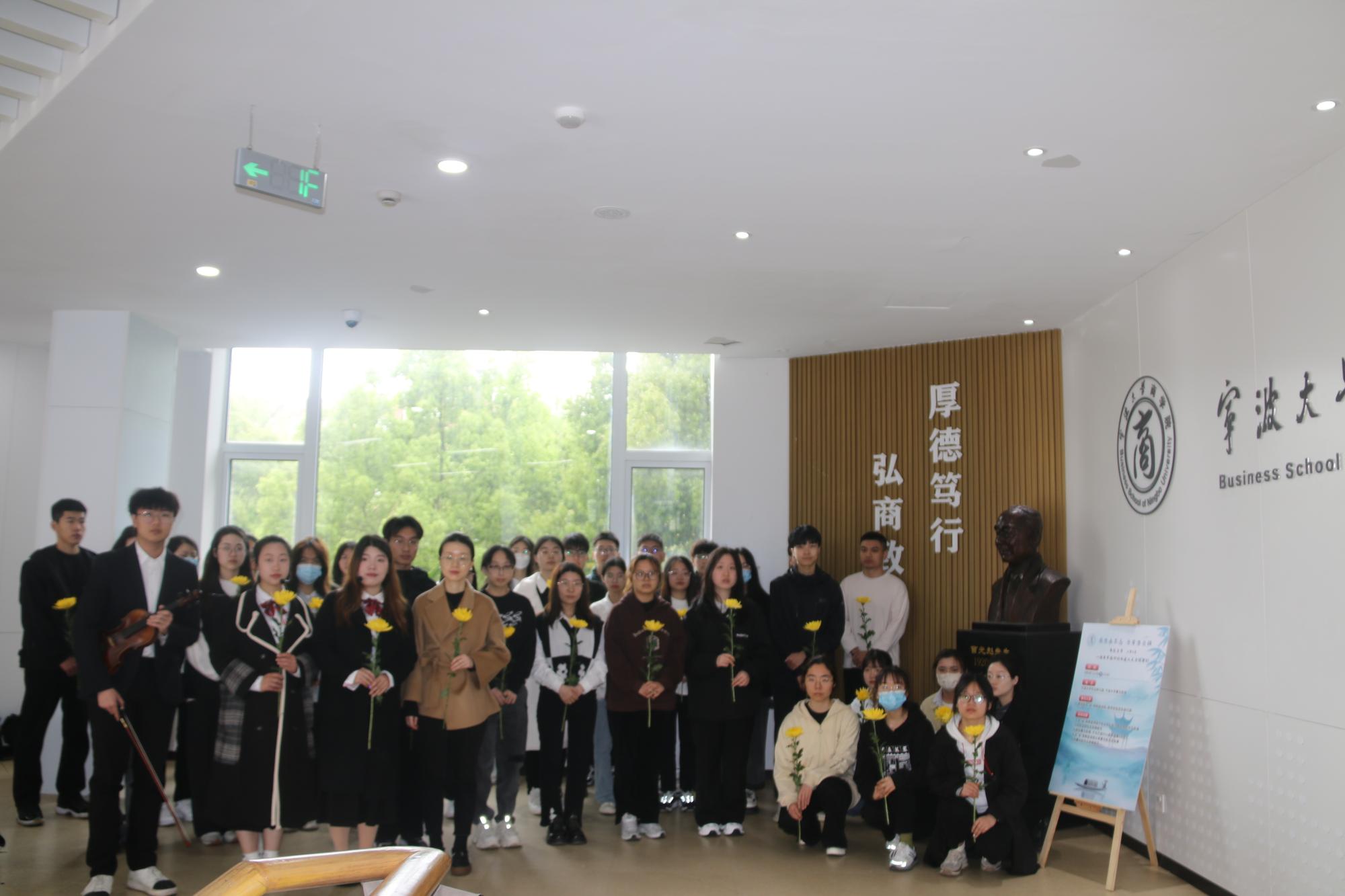 随后,一行人前往曹光彪楼,于大厅欣赏小提琴独奏《沉思》。一曲终了,文“话”商帮宣讲团分享了曹光彪先生的故事,“桃李不言,下自成蹊,斯人已逝,星火相传。感谢曹光彪先生为黄色小说 做出的无私贡献,为我们提供更好的教育资源,我们要感谢曹光彪先生,牢记宁波帮人士的付出,学习弘扬宁波帮精神”。宣讲团成员胡馨尹的话语久久萦绕在同学们耳边。仪式现场,同学们有序地在曹光彪先生铜像前献上献花。