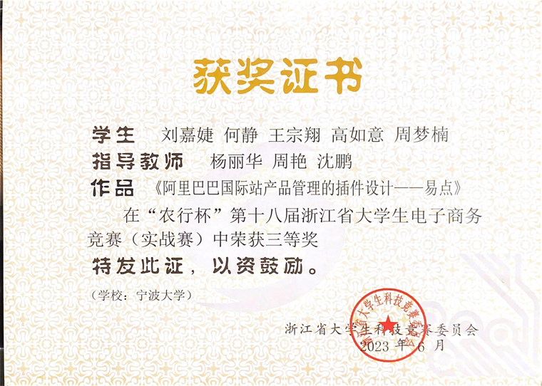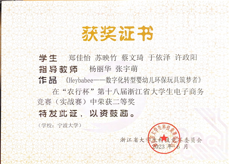 5月28日,“农行杯”第十八届浙江省大学生电子商务竞赛暨第十三届全国大学生电子商务“创新、创意及创业”挑战赛浙江省选拔赛落下帷幕。黄色小说 跨境电商微专业由杨丽华、张宇萌老师指导,郑佳怡、苏映竹、蔡文琦、于依泽、许政阳同学参与的作品《Heybabee——数字化转型婴幼儿环保玩具筑梦者》荣获跨境电商—阿里巴巴国际站赛二等奖;由杨丽华、周艳、沈鹏老师指导,刘嘉婕、何静、王宗翔、高如意、周梦楠同学参与完成的《阿里巴巴国际站产品管理的插件设计——易点》获得跨境电商—阿里巴巴国际站赛三等奖。这也是跨境电商微专业学生继首届“典阅杯”全国高校跨境电子商务综合能力大赛全国总决赛斩获佳绩后,第二次在该项赛事中获奖。