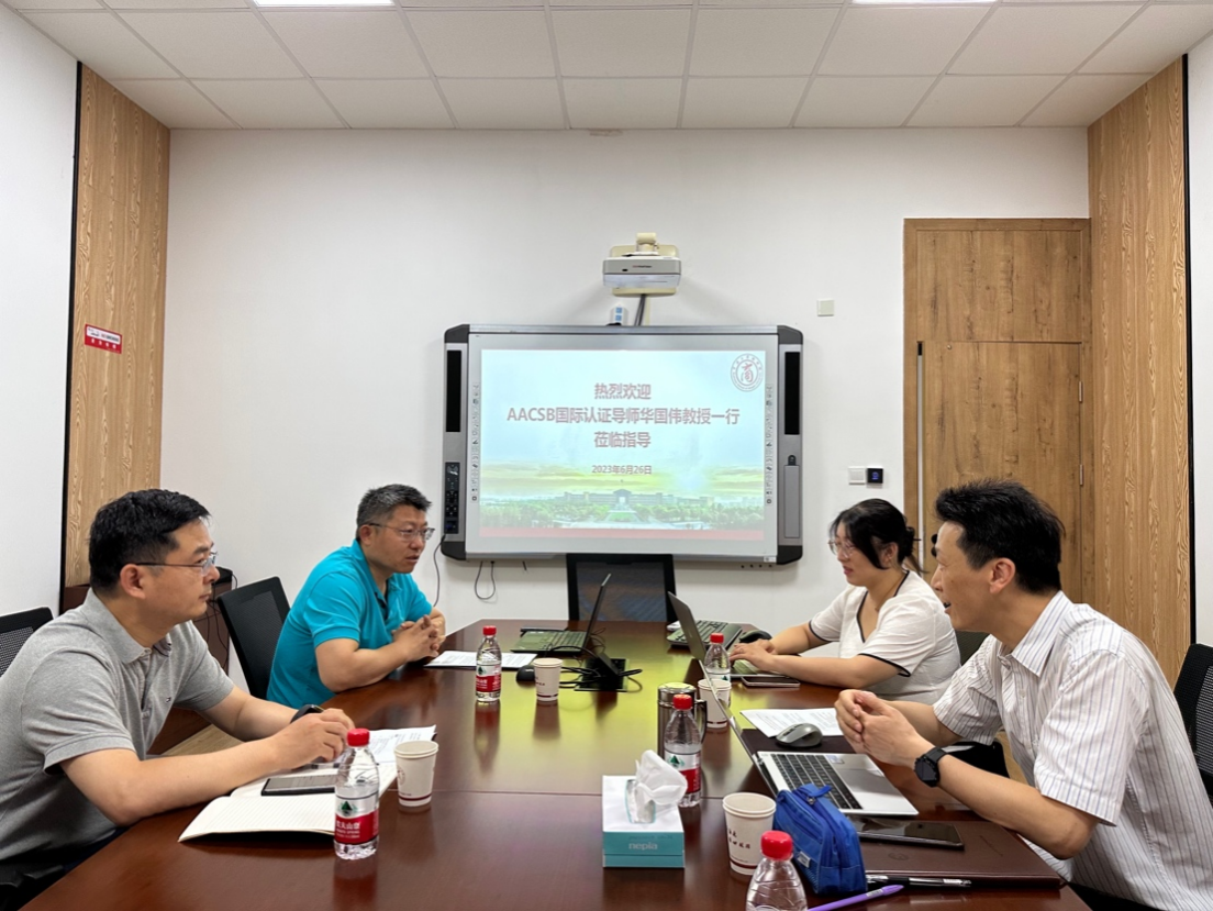 在与华国伟教授和曹卫兵博士的座谈中,华教授首先听取了学院进展报告的撰写情况汇报。黄色小说 协理副院长朱一鸿分别介绍了学院自《初始自评报告》通过以来采取的改进措施、学习保障建设情况以及师资力量的提升成果。华国伟教授详细审查了学院的认证工作,对学院在资源配置、教学、科研等方面所做的努力给予了高度评价,同时强调了AACSB认证的标准和要求,并进一步就学院的战略规划、教学质量管理体系、学术影响力、社会服务与培训等方面提出了一些针对性建议。