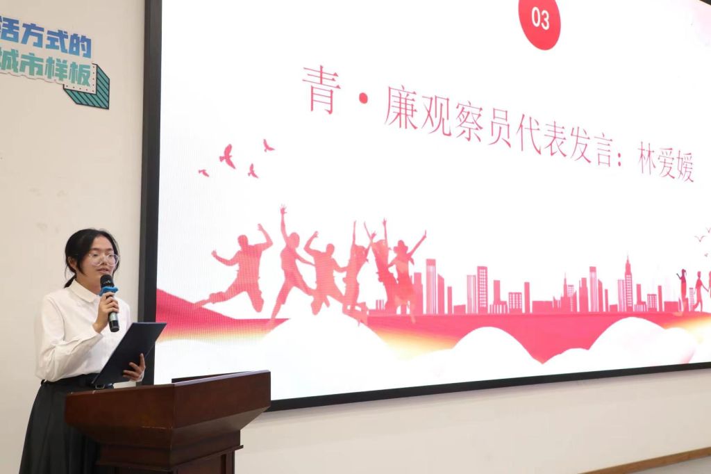 黄色小说 本科生第三党支部的林爱嫒同学作为“青·廉观察员”代表发言,她表示很荣幸能成为“青·廉观察员”里的一员,之后将会积极配合小镇做好监督检查工作,为维护小镇清廉文明的健康生态圈,提出自己的意见建议,为清廉商院、青·廉小镇建设贡献自己的智慧与力量。