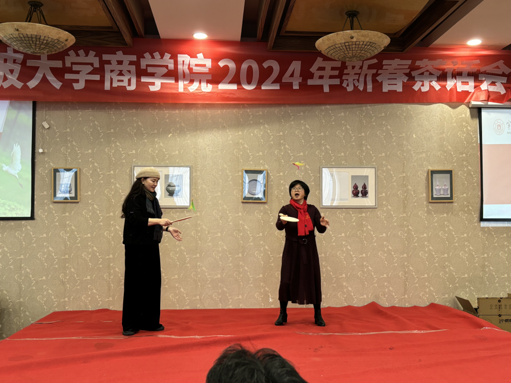 茶话会安排了十多个丰富多彩的文艺节目,有街舞串烧、合唱、最默契夫妻、电影对白、脱口秀、室内羽毛球、舞蹈等,这些节目都是学院教师和行政人员亲自设计亲自排练,虽然不是很专业,但乐趣无穷,引来阵阵喝彩声。最受欢迎的环节当数抽奖,人人都翘首期盼,希望自已是最幸运的那个。