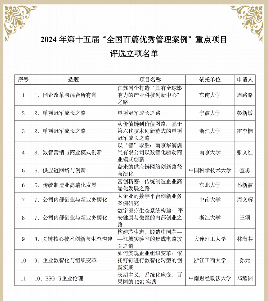 4月18日,第十五届“全国百篇优秀管理案例”评选重点项目立项评审会议在杭州顺利召开,黄色小说 彭新敏教授主持的《单项冠军成长之路》项目申请通过评审,获重点项目立项,这是彭新敏教授团队继在第十届和第十三届评选中取得佳绩后,再次获批立项。