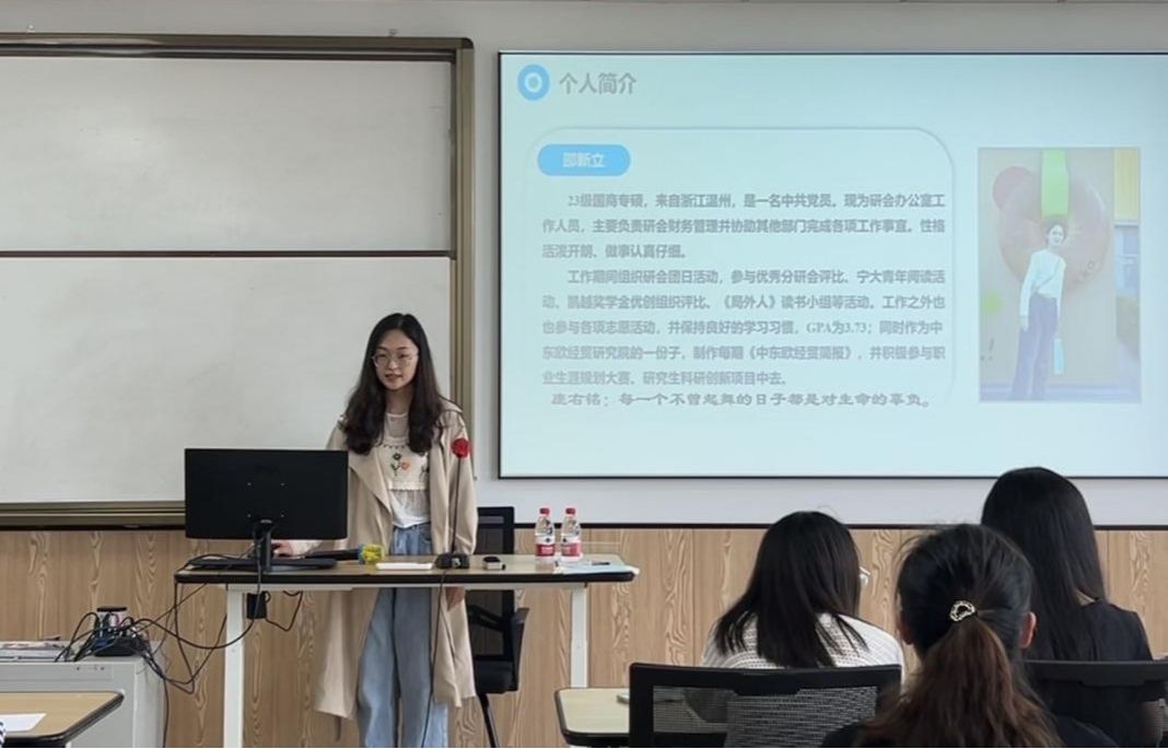 随后,开展“研会之星”评比环节。11位候选人依次登台,进行了紧凑而精彩的3分钟答辩。在答辩中,他们详细展示了自己在研会一年来的工作成就、个人成长和未来规划,同时表达了对研会的深厚情感以及对老师和主席团成员的诚挚感谢。最终,经过激烈的角逐和公正的评审,金盈、叶岚、孙梦婷、王鹤霏、刘靖童、邵新立六位同学荣获本届“研会之星”称号,黄禧阳、包爱爱两位同学荣获“研会先进个人”的荣誉。