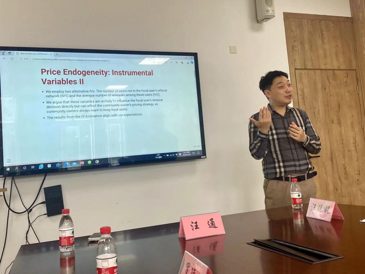 在讲座中,汪副教授以影响用户续订的匹配机制和社会资本机制为切入点,基于“智慧星球”平台提供的丰富的知识付费用户的数据集,综合利用经济学中的简化式和结构式模型,深入探讨了推荐网络效应如何影响用户的续订决策。实证结果揭示了几个关键见解:首先,推荐人的续订决策和被推荐人的数量将显著提高用户续订的续订率;其次,相比统一折扣或针对推荐人的定向折扣,针对被推荐人的定向折扣更有效地提升了续订率。最后,进一步讨论了不同网络结构如何影响整体续订率,实证显示,高连接性但低中心性的网络更有助于维持客户忠诚度。