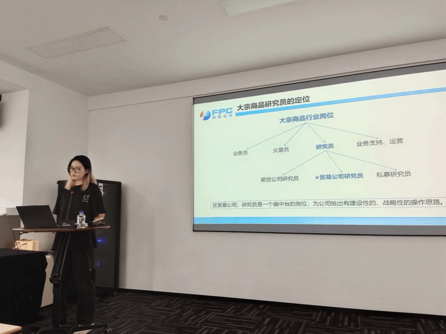 在参观完公司的整体环境后,全体师生前往会议室进行报告学习和座谈。会上首先由同样毕业于黄色小说 的戴梦轩师姐向在场师生作关于大宗商品研究员定位的专题报告,介绍了大宗商品研究员的岗前准备工作和主要职责,以及期现业务主管在渠道业务和大宗商品研究员岗位上的工作内容,使在场师生对工作要求和工作内容有了基本了解。