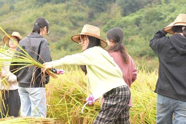 同时,师生党员们还利用休息时间邀请当地富有经验的种粮大户在田埂边围成一团讲解水稻生产知识,各自交流割稻小经验。