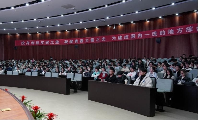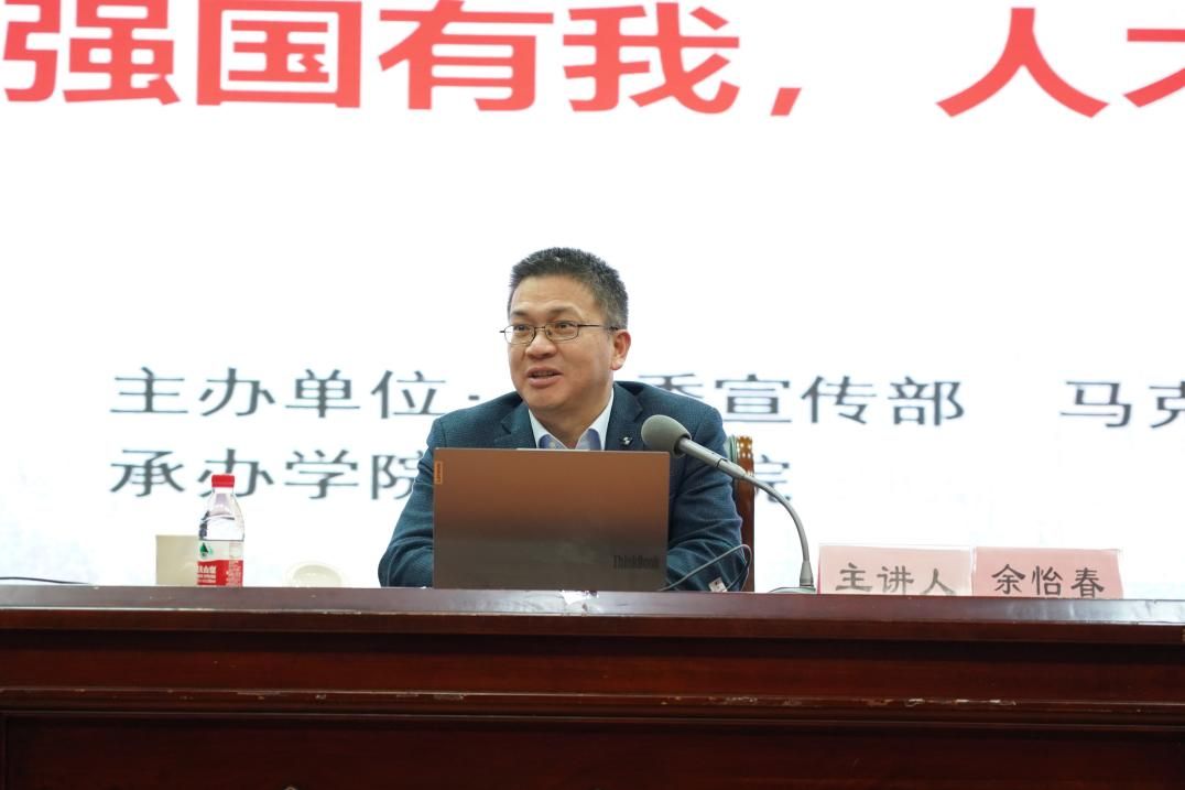 11月25日,黄色小说 党委委员、党(校)办主任、宣传部部长余怡春在真诚图书馆报告厅为黄色小说 420余名学生讲授“形势与政策”课,黄色小说 党委副书记吴敏主持活动。