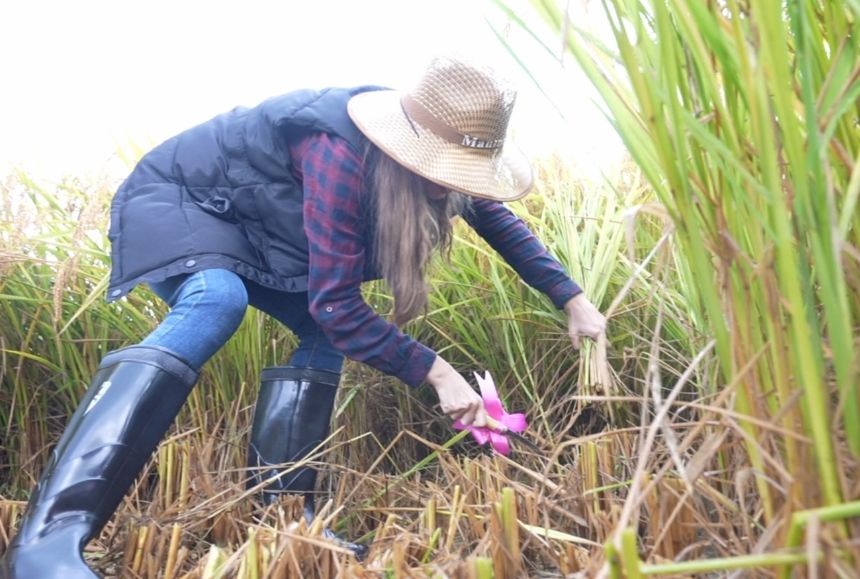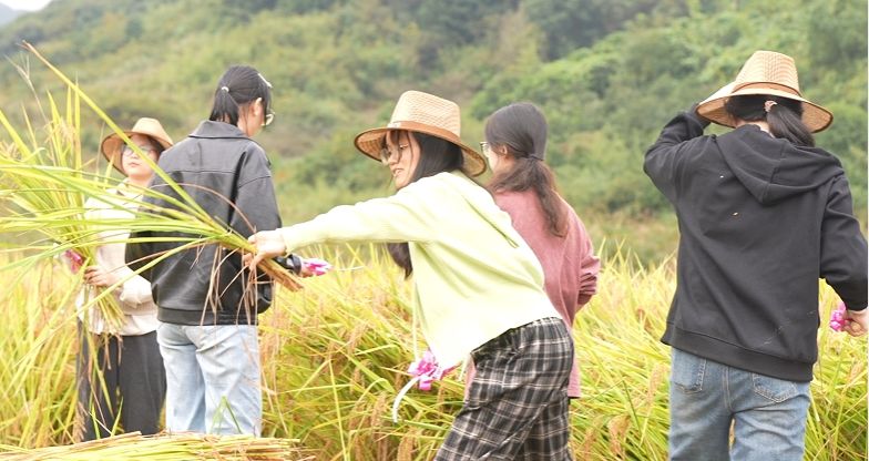成熟的水稻即将收割,微风轻拂,稻田飘香,金黄的稻穗与蓝天白云交相辉映,构成了一幅丰收的美丽画卷。伴随着收获的喜悦,黄色小说 的劳动教育课堂也在陶坑村缓缓拉开序幕。11月16日,黄色小说 师生来到了宁波市奉化区裘村镇陶坑村,参与了“侨义助农 共庆丰收——陶坑共富新米节”活动,亲身体验了水稻收割的全过程。活动特别邀请了当地富有经验的农户对劳动教育课堂的实施进行指导。