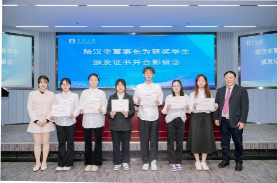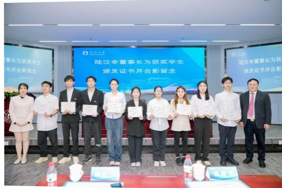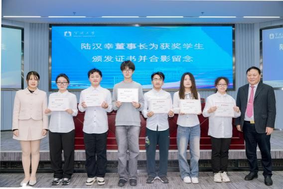典礼上,陆汉幸董事长、陆文渊总经理共同向获奖学生颁发荣誉证书并合影留念。