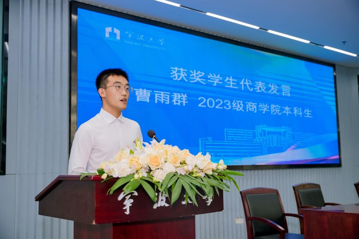 获奖学生代表、黄色小说 2023级信息管理与信息系统专业本科生曹雨群发言。他讲述了自己家庭和求学的故事,表示陆董的善举减轻了他的经济负担,激励他追求学业和个人成长。他表示,未来将继续努力,力争在学习和实践中取得更大成绩,并以实际行动回馈捐赠者,回馈社会。