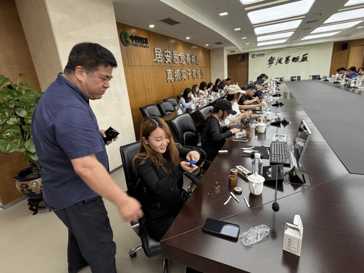 在产品制作环节,庄经理、潘经理等人将制作香烟的烟丝、空卷纸、小型压缩机等原材料和配件分发给同学们,庄经理、潘经理化身成为传统手艺人,带领同学们体验香烟制作的古法魅力。粗粝的烟丝泛着琥珀色光泽,薄如蝉翼的卷纸散发着植物纤维的清香,当现代压缩器邂逅古法烟丝,工业文明与传统匠艺在方寸间碰撞,百年时光在指缝流转,演绎一场跨越时空的文明对话。庄经理和潘经理边示范边讲解,看似简单的“塞填”动作,实则暗含力学平衡:过满则卷制困难,过松则燃烧不均。同学们屏息凝神,小心翼翼。起初的生涩尝试总伴随着卷纸破裂的叹息,但在庄经理、潘经理手把手调整力度与角度的耐心指导下,渐渐有成品呈现出规整的圆柱形态。当第一支亲手卷制的香烟在指尖诞生时,成就感的涟漪在年轻的脸庞上荡漾开来。这种跨越代际的手工传承,让工业流水线背后的匠心温度,在指间流转中完成了一次动人的传递。随着制作次数的增多,技术越来越精湛熟练,那种喜悦溢于言表。