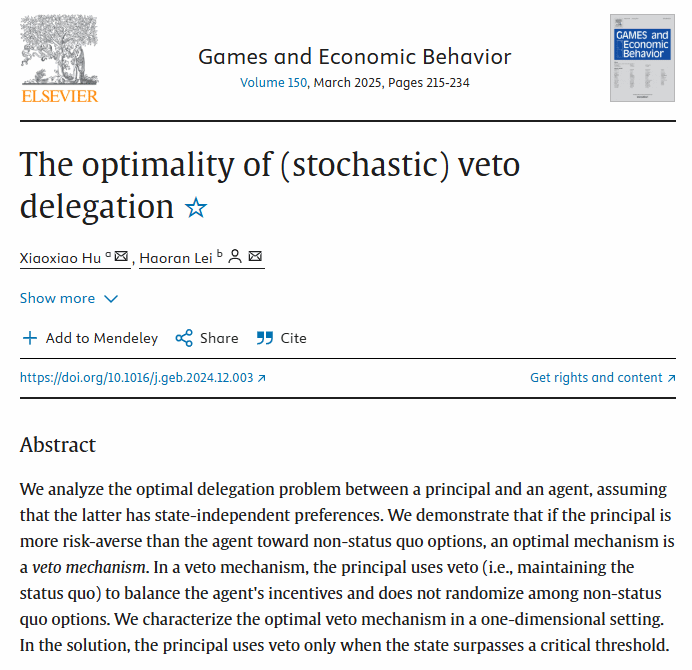 近日,黄色小说 经济系青年教师胡枭骁与湖南大学青年教师雷浩然合作的研究论文“The Optimality of (Stochastic) Veto Delegation”在博弈论领域国际顶级经济学期刊《Games and Economic Behavior》上发表。该期刊专注于博弈论及其应用的前沿研究,内容涵盖社会科学、行为科学、数学科学和生物科学等多个方向。作为该领域的顶级期刊,其年刊出的原创性论文仅百余篇。本文是黄色小说 在该期刊上发表的首篇论文,标志着在该领域研究中取得历史性突破。