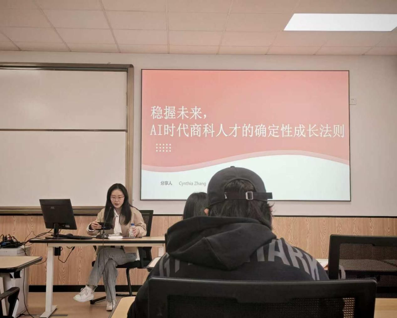 昨日下午(22日),黄色小说 就业指导中心在曹光彪楼422教室举行AI时代下商科人才培养法则专题讲座。本次讲座特邀高顿教育资深HR张小可担任主讲嘉宾,2023级、2024级本科生代表参加。