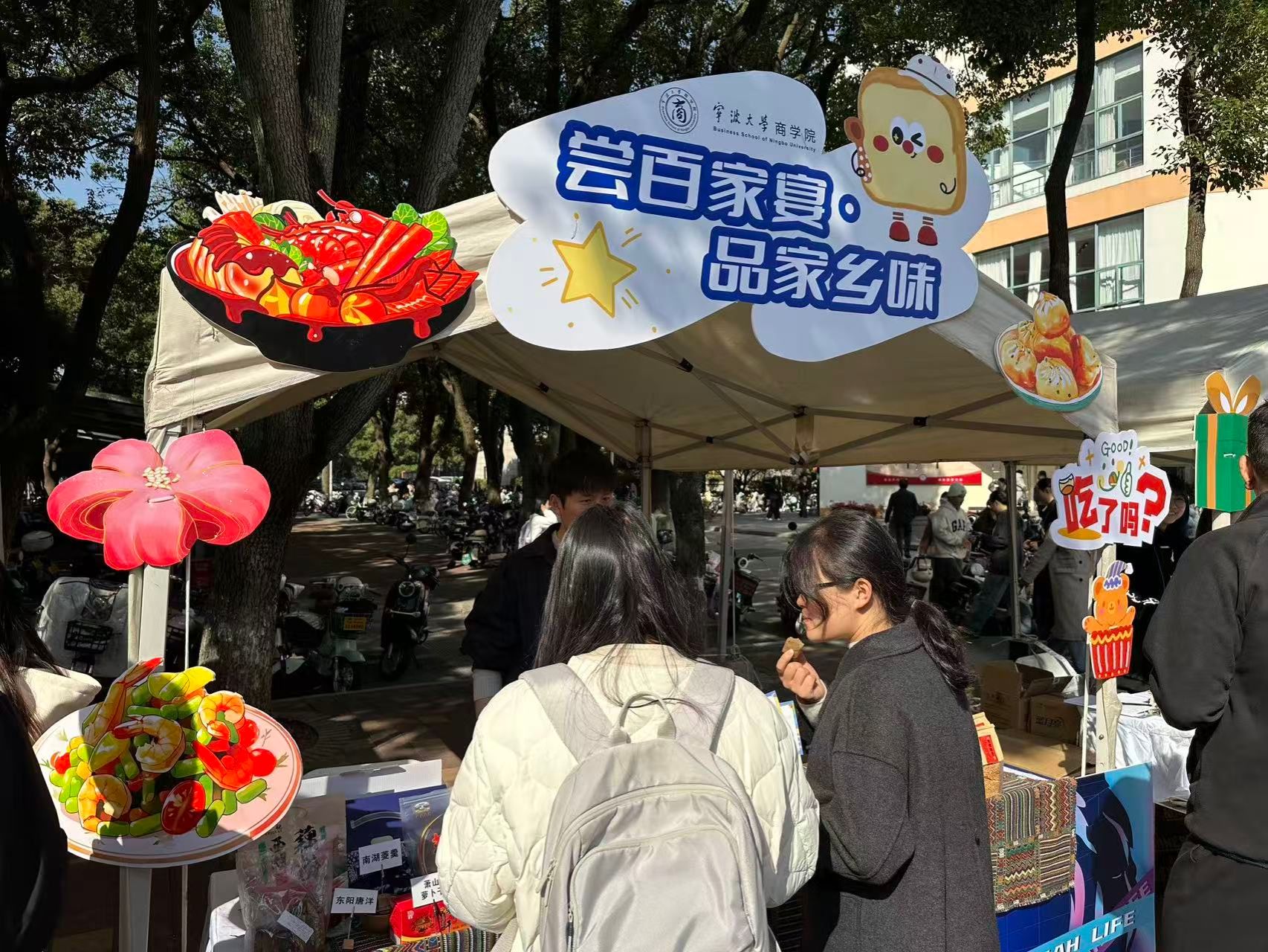 初冬渐冷,温情不减。26日,黄色小说 社区管理委员会(以下简称“商社委”)联合校学生宿舍管理委员会共同开展“爱心助农,品质共享”社区文化节爱心助农活动。本次活动涵盖9个展示摊,直接参与学生超百人。此次活动中,商社委携手奉化区桃家寨共富工坊,将地道的壮族美食与浙江省当地特色农产品和小吃带到宁大学子身边,搭建从助农到学校的暖心桥梁,也为这个初冬增添了一抹靓丽的色彩。