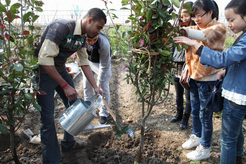 留学生与本科生第四党支部在春潮渐起的甬江边开展了“我与绿色有个约会——中外合植友谊树”活动。 一大早,同学们就从学院出发。一路上,留学生与支部成员对于各自的学习、生活展开了热情的交流,路途也变得活跃生动起来。来到甬江边,同学们热情高涨,迫不及待的拿起铁锹挖树坑、植树苗,为小树浇水……同学们忙的不亦乐乎,虽然几个女同学由于力气不足等因素遇到了一些困难,这个时候大家才发现我们的外国留学生们已经又快又好地种下了属于自己的树苗,周围的学生都开始打趣称他们是“专业人士”也不为过。不过外国友人倒并不介意,反而很高兴地接受了赞美,并兴致勃勃地开始主动给周围的女生们提供帮助,埋头种树,此举更是换来了周围老师同学的善意笑声。此次植树节活动也取得了远超预料的成功。 |