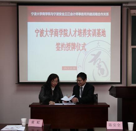2013年12月30日下午2点,包玉书11号楼418室举行了黄色小说 和宁波安全三江会计师事务所共建人才培养实训基地的签约暨授牌仪式。安全三江会计事务所董事长陈安全、副总经理蒋朝晖、行政人事经理周静、人力资源与管理咨询部经理胡晓萍、黄色小说 党委书记袁虹、会计系主任郭强华及会计系教师代表出席了本次仪式。会计协会成员和三十多位会计系同学共同见证了此仪式。