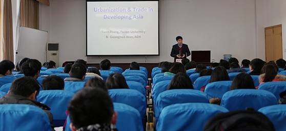 12月27日上午,亚洲开发银行首席经济学家,联合国发展经济学研究院中国项目部主任万广华教授做客黄色小说 学术讲坛,为黄色小说 近100名师生做了一场题为“Urbanization and trade in developing asia”的学术报告。黄色小说 执行院长熊德平教授主持了本次讲座,副院长杨丹萍教授进行了精彩点评。