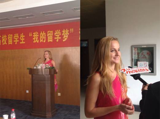 2013浙江省高校留学生“我的留学梦”演讲比赛是浙江省外国留学生第七届“梦行浙江”系列活动的一项重要活动之一,鼓励外国留学生讲述自己的留学故事、与浙江的情缘、发现浙江最美的人、最美的事等,并推荐产生本届“梦行浙江”外国留学生中华才艺展演活动的主持人,增进他们对浙江的感情。比赛邀请了专业的评委老师,全省共有50名高校留学生参加,黄色小说 碧海同学是45号出场。可人的外形、自信的笑容、精彩的留学梦给在场的评委以及观众留下深刻的印象,大家记住了这位喜欢汉语的金发女孩。据悉,碧海还代表我校参加中央电视台的《五月的鲜花》五四晚会。