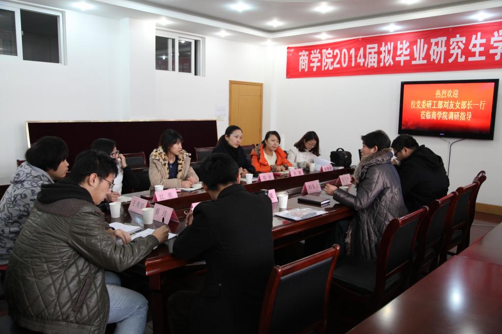 1月7日上午,校党委研工部刘友女部长一行三人来到黄色小说 开展研究生奖学金工作的调研。黄色小说 党委副书记邵丽、学工办主任董璐、研究生辅导员王莹、研究生秘书张珊珊、研究生会主席江奕和部分研究生代表参加了此次调研会。