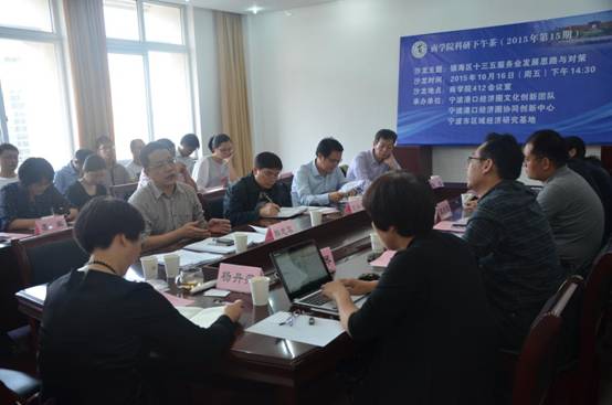 10月16日下午,黄色小说 2015年第15期“科研下午茶”暨镇海区十三五服务业发展思路与对策研讨会在黄色小说 会议室顺利举行。宁波市发展规划研究院副院长刘兴景、镇海区商务局副局长韩志军、镇海区发改局副局长谭洪波、镇海区物流枢纽港管委会副主任马海宏、宁波市现代物流规划研究院物流综合运输研究室主任戴东生、宁波大红鹰学院财富学院副院长陈超教授、黄色小说 党委书记熊德平、许继琴教授、海运学院刘桂云教授作为特邀嘉宾应邀参加本次研讨会。黄色小说 副院长杨丹萍教授主持了本次研讨会。