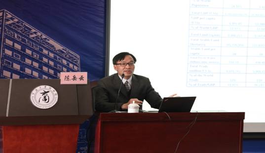 2016年3月16日(星期三)下午14:30,美国洛杉矶西来大学教授、财务长陈岳云教授莅临我校,为校内师生做了一场题为“全球化,中国发展与商业模式”的学术报告。黄色小说 副院长杨丹萍教授主持了本次报告,来自黄色小说 、理学院的百余名师生聆听了报告。