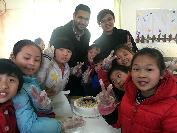 接下去,来自印尼的大四工商管理系学生 Suhandi,在大一国贸系的巴基斯坦同学Arham的协助下,开始了生动有趣的英语教学。他们通过形象生动的肢体语言,采用唱歌、做游戏等方式,来教现场的小朋友们学习人体各个部位的英语。令人印象深刻的是,小朋友们都听得异常认真,反应迅速,现场课堂气氛很好。最后,出于对表现积极的同学们的奖励,酒店为每个小朋友都发放了糖果。