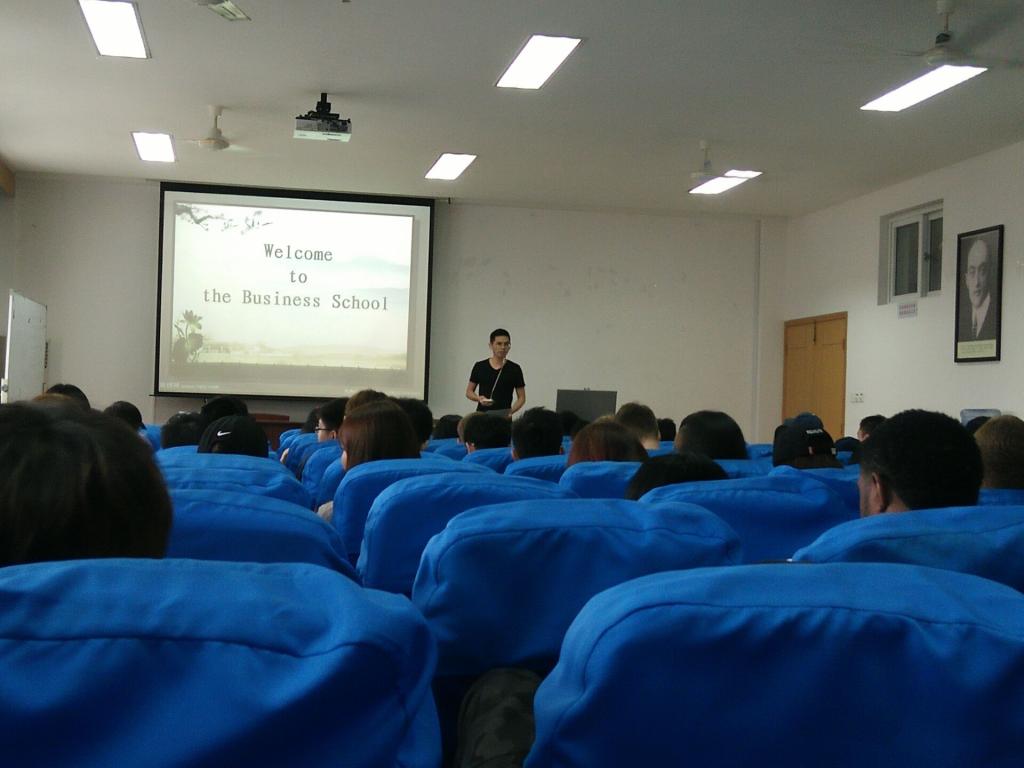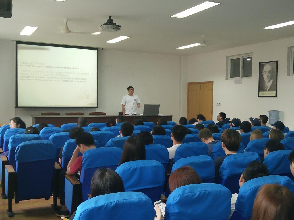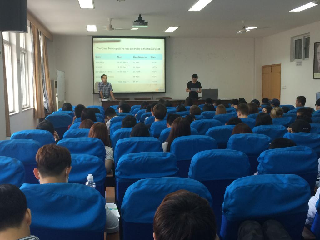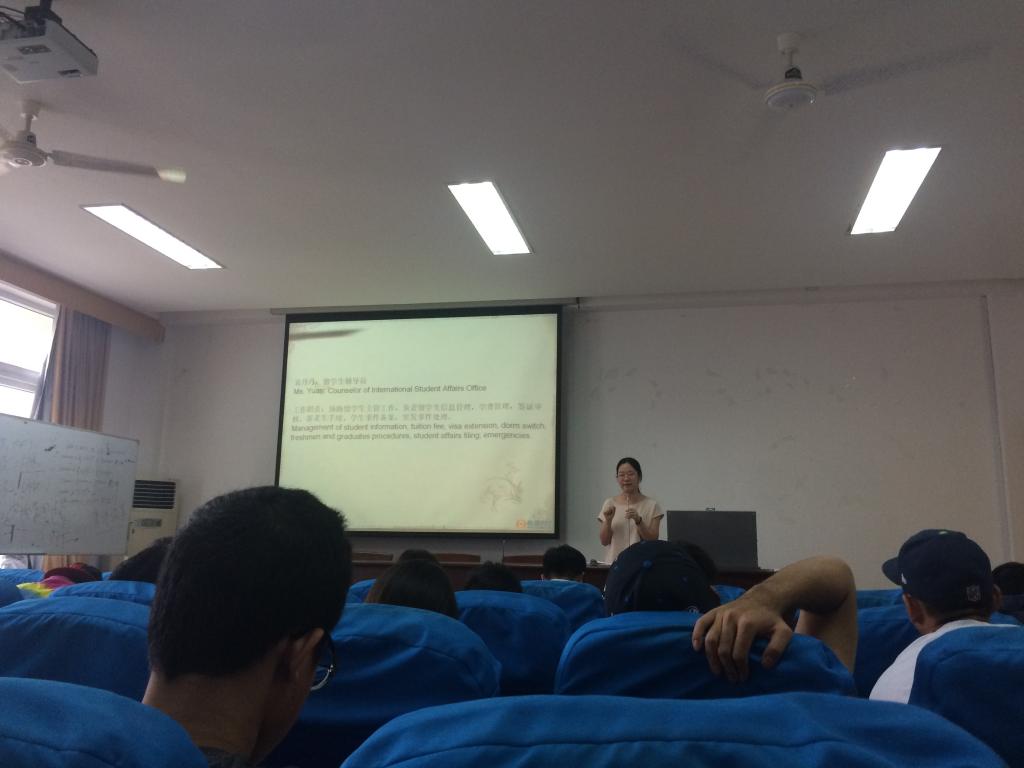 上午10点,新生们陆续到达了黄色小说 414教室。首先,毛老师向大家介绍了留学生办公室成员,并陈述了成员的职责和联系方式。接着,各班班主任进行了自我介绍并宣布了班会时间及地点。随后,王小西老师向新生们介绍了相关课程安排并且为新生们答疑解难。最后,老生代表Munawar发表了的精彩的演讲,向新生们深情并茂的讲述自己在中国的留学经验并给予新生一些学习和生活上的建议。会议结束之后,留学生组老师以及老生代表带领了新生进行了游园活动。