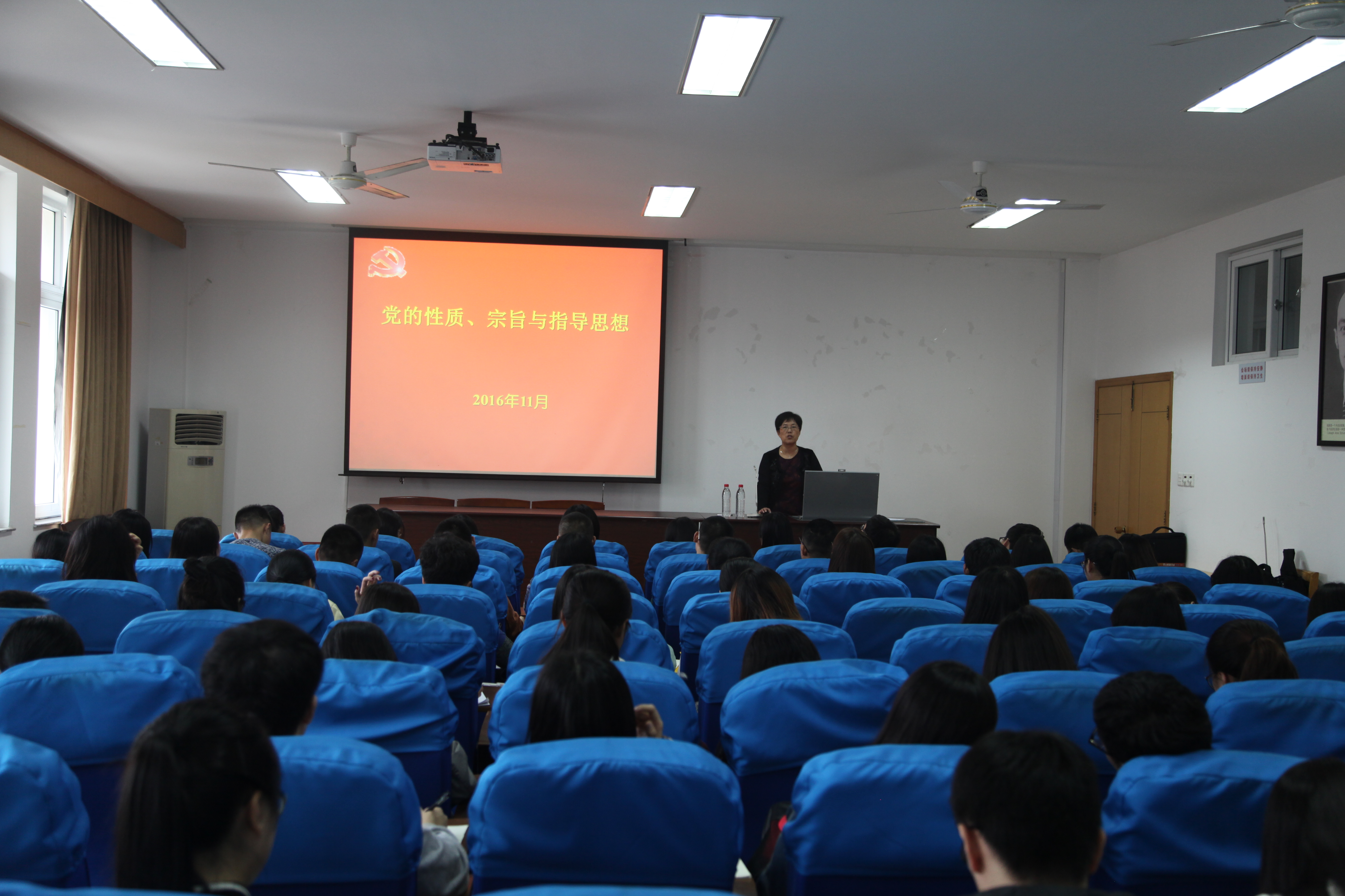 11月21日中午,黄色小说 党委分党校第35期入党积极分子培训班在包玉书科学楼11#414会议室正式开班。近100名积极分子参加了这次的动员报告。黄色小说 党委书胡亚娥作了开班动员,并为全体入党积极分子上了题为《中国共产党的性质与指导思想》的党课。