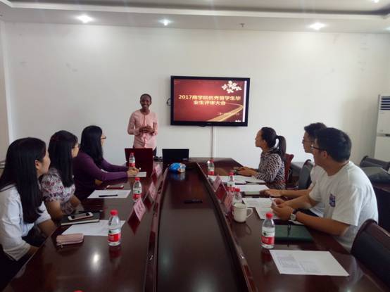 5月27日,黄色小说 2017届优秀留学生毕业生评审会在学院412会议室顺利举行。学工办主任董璐,辅导员毛跃祖、蒋鹏涛,班主任张亚越等代表参加了此次评审会。经学生自助申请,班主任推荐,共有十三名优秀留学生毕业生代表进入评审会答辩环节。